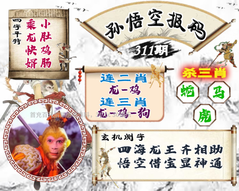 | 311期:复式连肖【猪鼠鸡狗猴虎】中4个 |